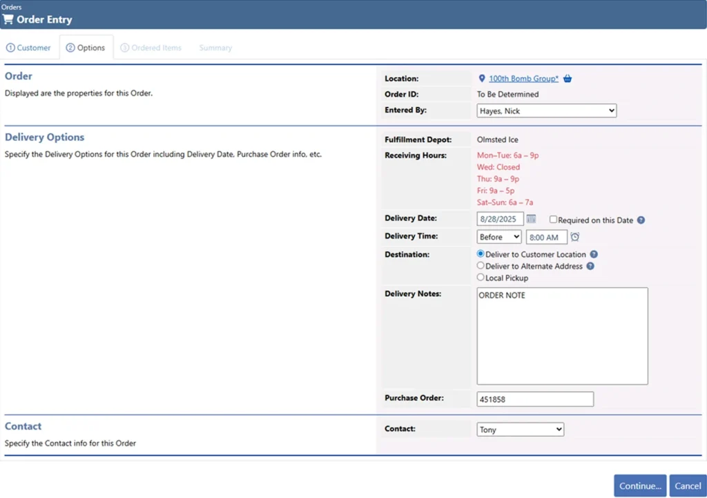 Auto Orders: Any order created for that customer will already include the Receiving Hours, ensuring Route Optimization schedules the stop within the correct window.