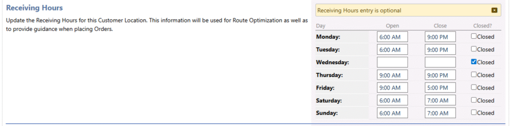Overall: Adding receiving hours reduces wasted trips, increases route accuracy, and creates a smoother experience for both your team and your customers.